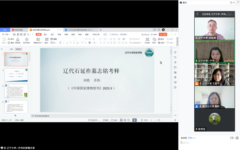 2023年4月22日,由辽宁大学历史学部历史学院和黑龙江大学历史文化旅游学院联合举办的“古代东北边疆与民族”工作坊(第一期)在线上顺利举行。来自辽宁大学、黑龙江大学、渤海大学,以及黑龙江省社会科学院等科研机构共17名学者参加了本次学术交流研讨活动。